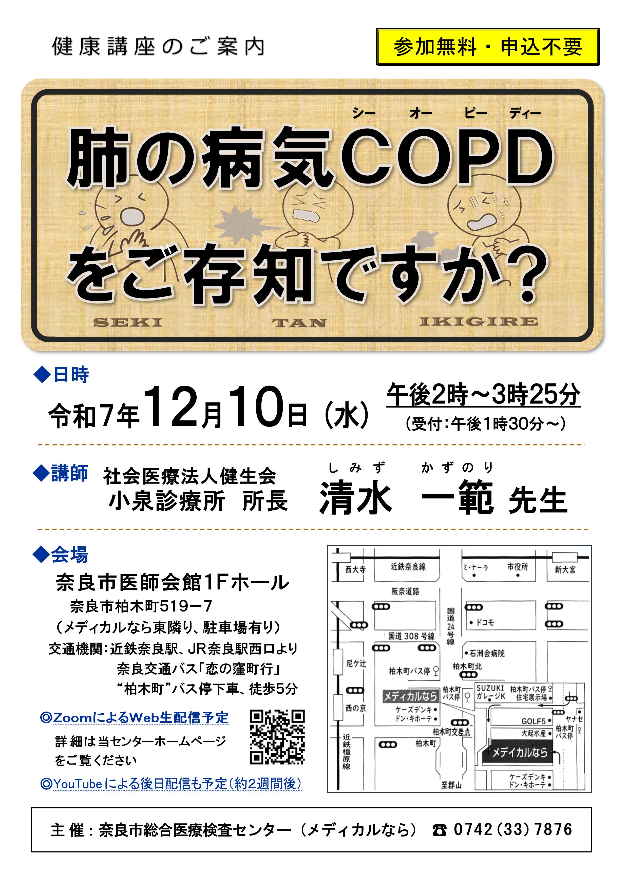 「肺の病気COPDをご存知ですか?」 社会医療法人健生会 小泉診療所 所長 清水 一範(しみず かずのり)先生 Zoomライブ配信会場(準備中) |